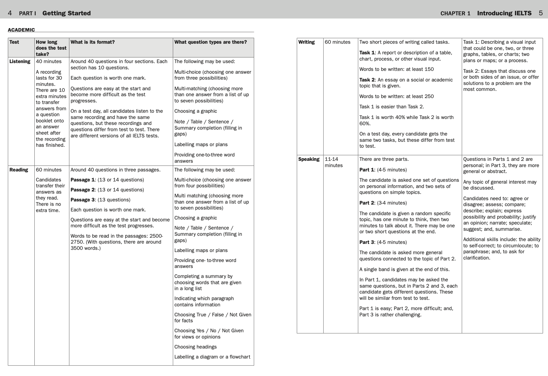 - Phần 1: Getting Started – Giới thiệu chi tiết cấu trúc kỳ thi IELTS và từng kỹ năng, cùng cách chấm điểm mà không phải sách nào cũng nói rõ.