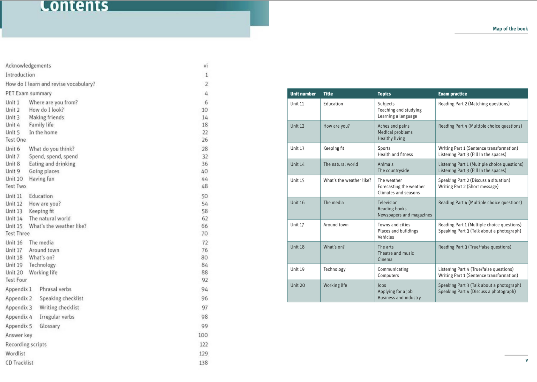 Cuốn sách gồm 20 unit siêu gọn, siêu chất lượng, mỗi bài là một chủ đề quen thuộc trong bài thi PET như: